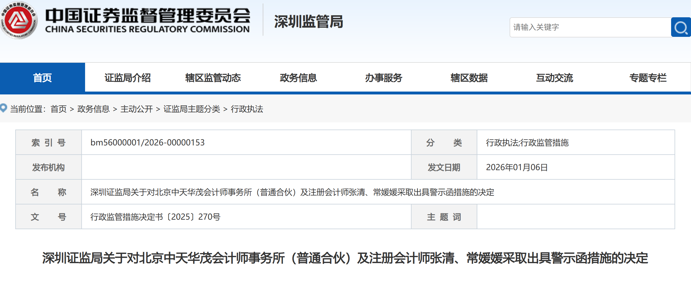 1月6日,据深圳证监局官网,北京中天华茂会计师事务所(普通合伙)及注册会计师张清、常媛媛被采取出具警示函的监管措施。