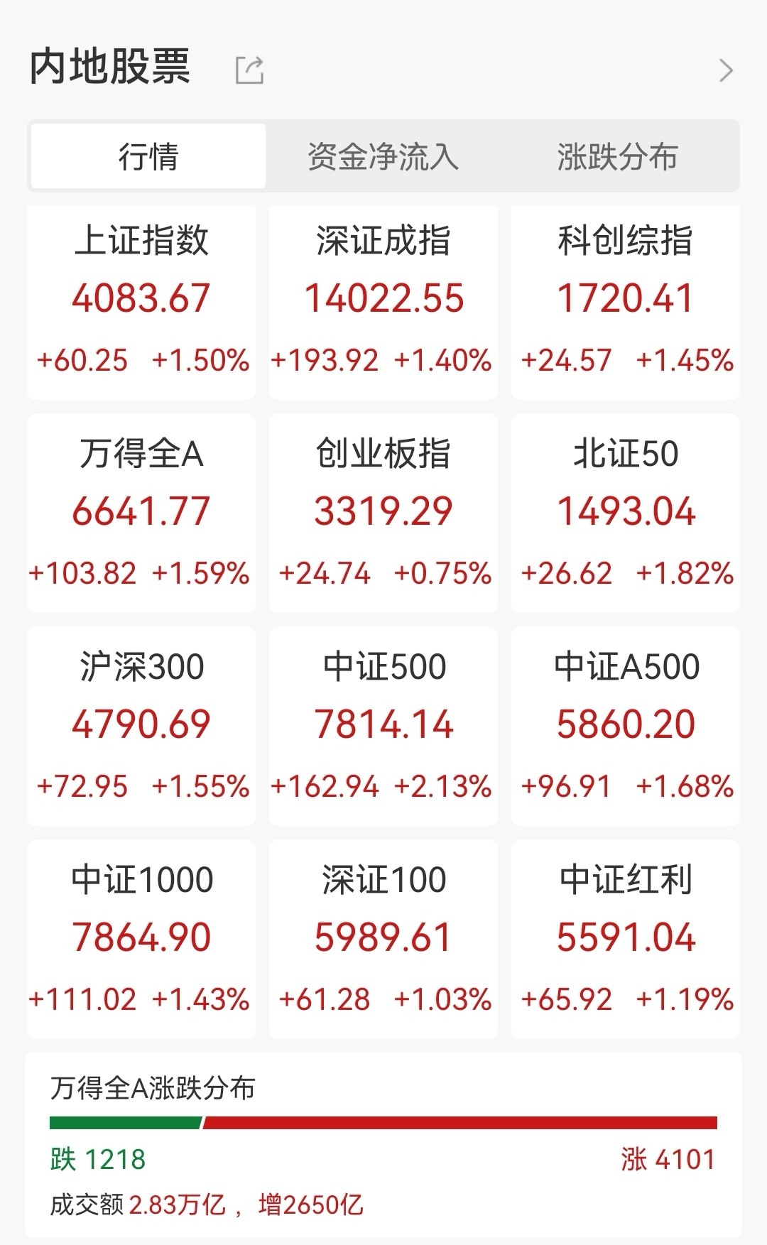 截至收盘,沪指涨1.50%,收报4083.67点;深证成指涨1.40%,收报14022.55点;创业板指涨0.75%,收报3319.29点。两市成交额冲到2.83万亿元,创三个多月新高,比昨天足足多出2600多亿,市场热度可见一斑。个股更是涨声一片,超4100只股票飘红,涨停家数达到143只,连续两天“百股涨停”。
