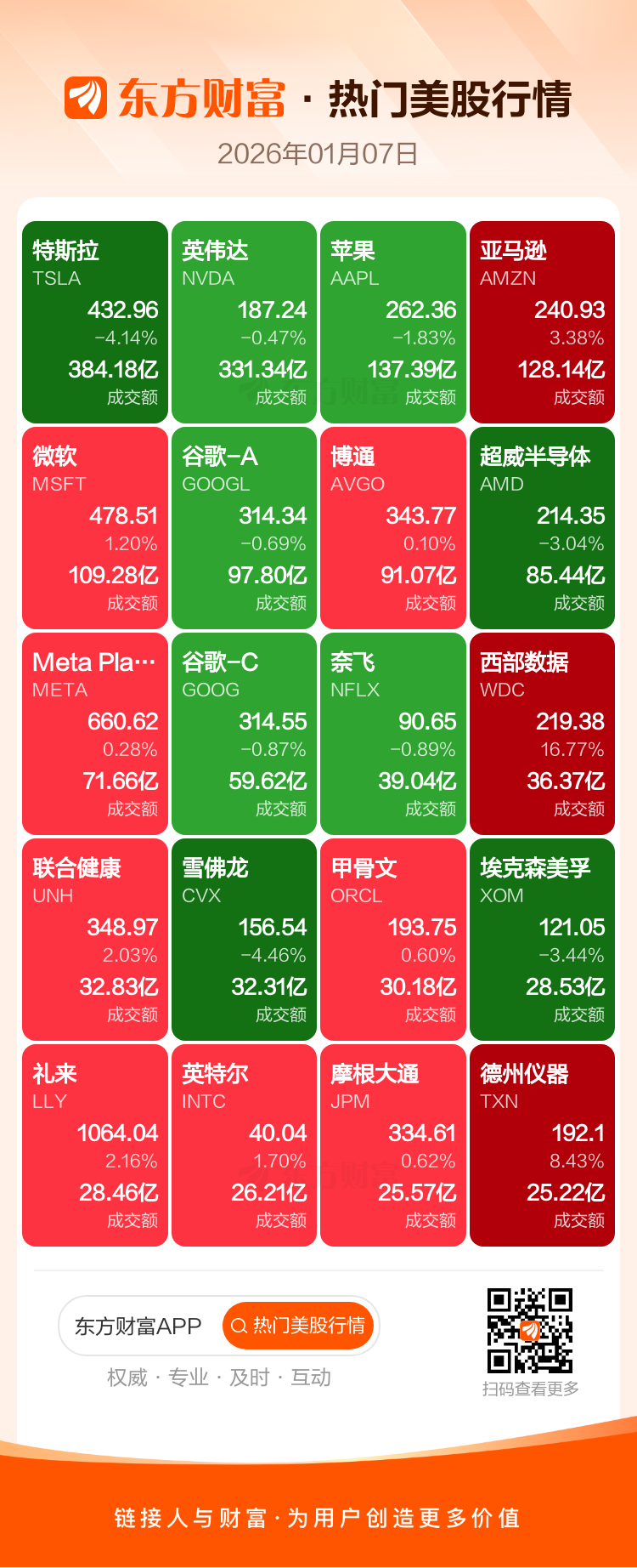 特斯拉跌4.14%,英伟达跌0.47%,苹果跌1.83%,亚马逊涨3.38%,微软涨1.20%,谷歌-A跌0.69%,博通涨0.10%,超威半导体跌3.04%,Meta Platforms Inc-A涨0.28%,谷歌-C跌0.87%。