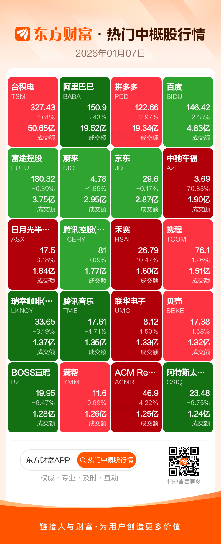 台积电涨1.61%,阿里巴巴跌3.43%,拼多多涨2.97%,百度跌2.18%,富途控股跌0.39%,蔚来跌1.65%,京东跌0.17%,中驰车福涨70.83%,日月光半导体涨3.18%,腾讯控股(ADR)跌0.09%。