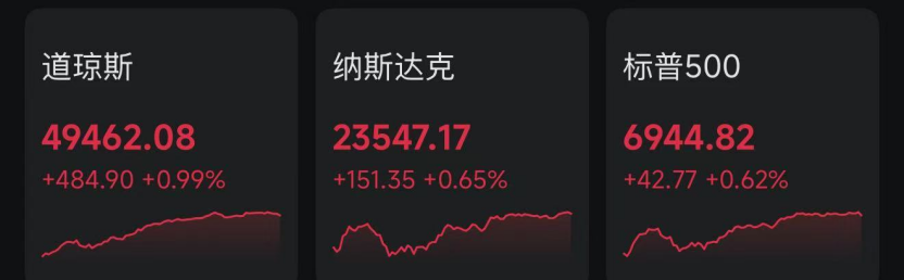 当地时间周二,美股三大指数集体收涨。截至收盘,道指涨484.90点,涨幅0.99%,报49462.08点;纳指涨151.35点,涨幅0.65%,报23547.17点;标普500指数涨42.77点,涨幅0.62%,报6944.82点。