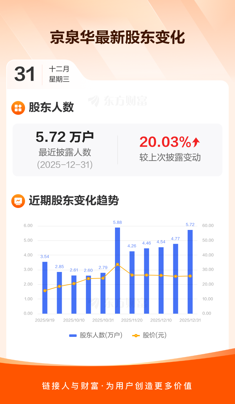 京泉华:截至12月31日最新股东户数5.72万户,较上期增加20.03%