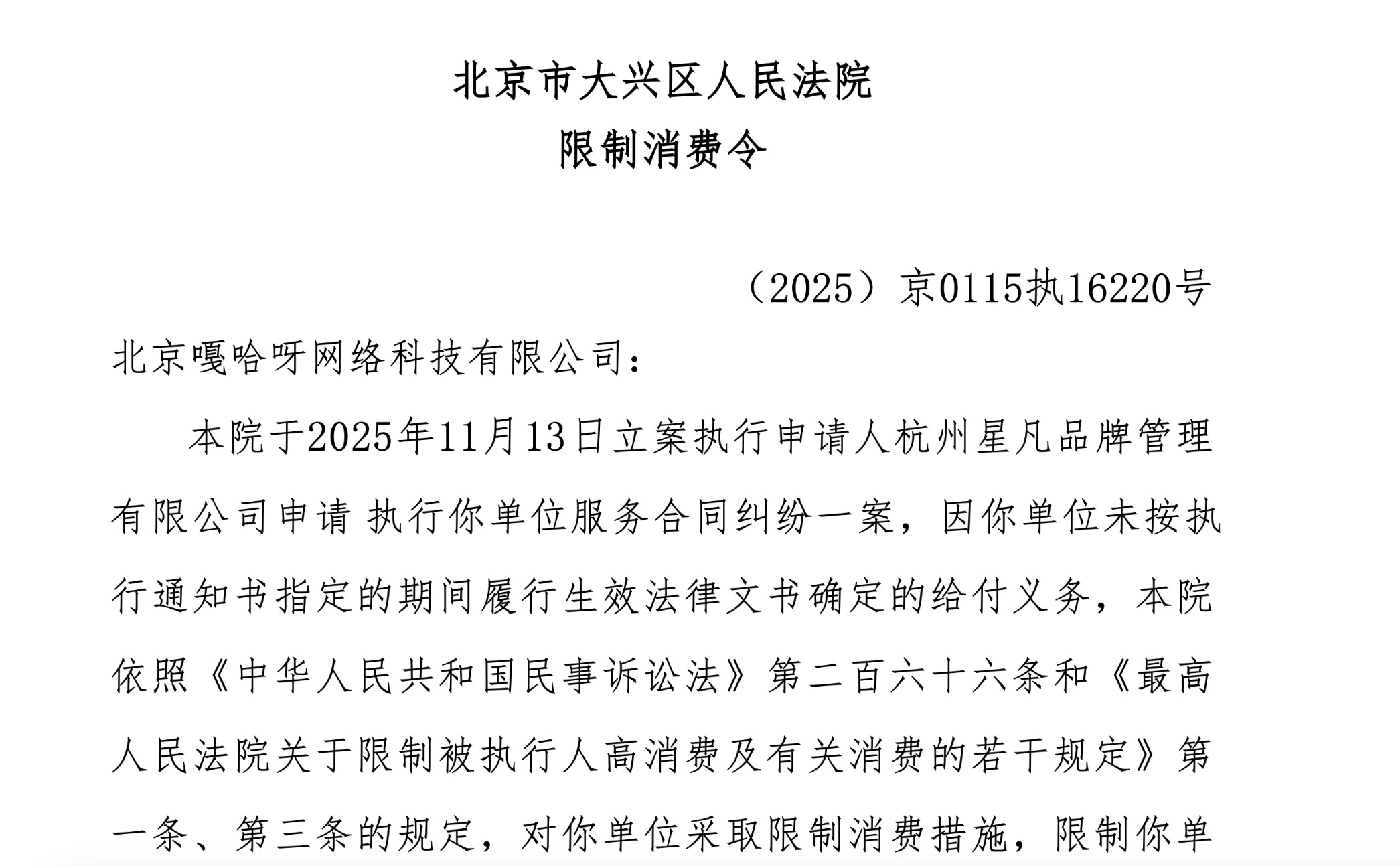 近日,北京嘎哈呀网络科技有限公司(下称“北京嘎哈呀”)被申请限制高消费令。