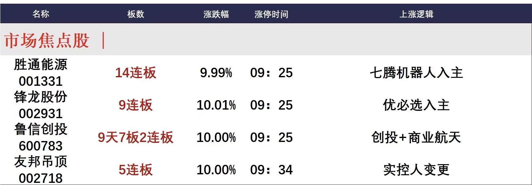 今日午盘全市场共70股涨停,连板股总数22只,26股封板未遂,封板率为73%(不含ST股、退市股)。焦点股方面,实控人变更的胜通能源14连板、锋龙股份9连板、友邦吊顶5连板,商业航天概念股鲁信创投9天7板。