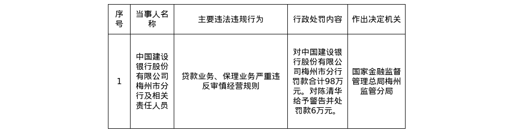 建行梅州市分行被罚98万,责任人被罚6万