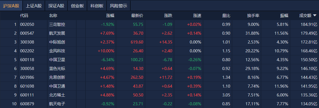 个股方面,三花智控成交额超184亿元居首,航天发展、中际旭创、金风科技成交额靠前。