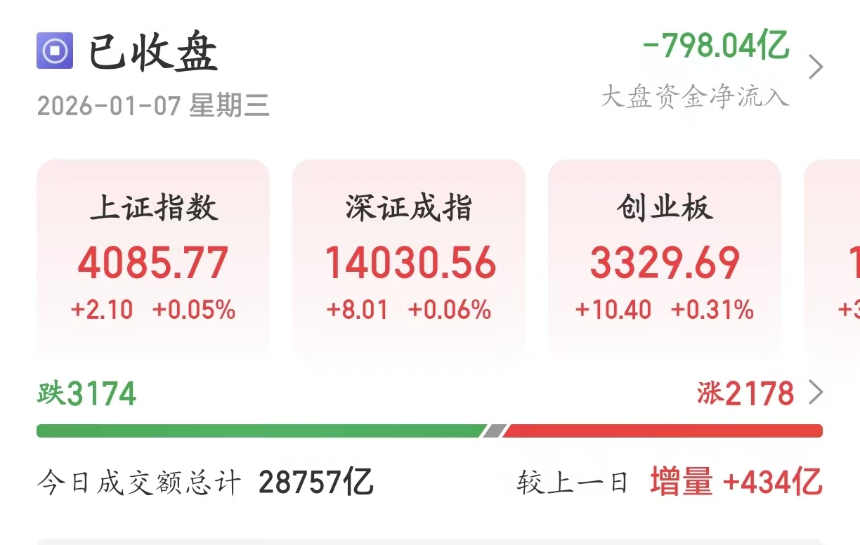 1月7日,A股大盘14连阳,创出史上最长连阳纪录,上涨0.05%,报收4085.77点。深证成指上涨0.06%,创业板指上涨0.31%。
