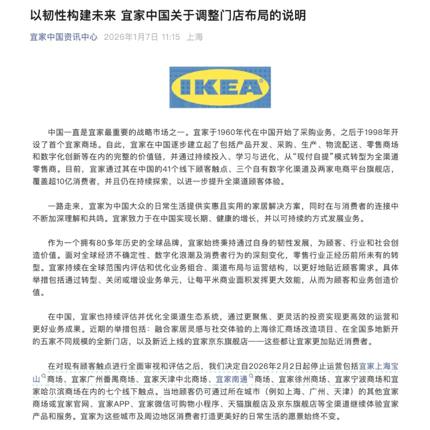 1月7日午间,宜家中国发布消息称,在对现有顾客触点进行全面审视和评估之后,决定自2026年2月2日起停止运营包括宜家上海宝山商场、宜家广州番禺商场、宜家天津中北商场、宜家南通商场、宜家徐州商场、宜家宁波商场和宜家哈尔滨商场在内的七个线下触点。