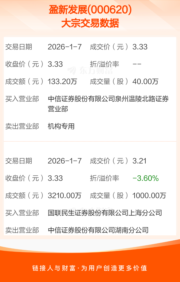 2026年1月7日,盈新发展发生2笔大宗交易,共成交1040.00万股,成交金额3343.20万元,占其流通市值比例为0.21%。