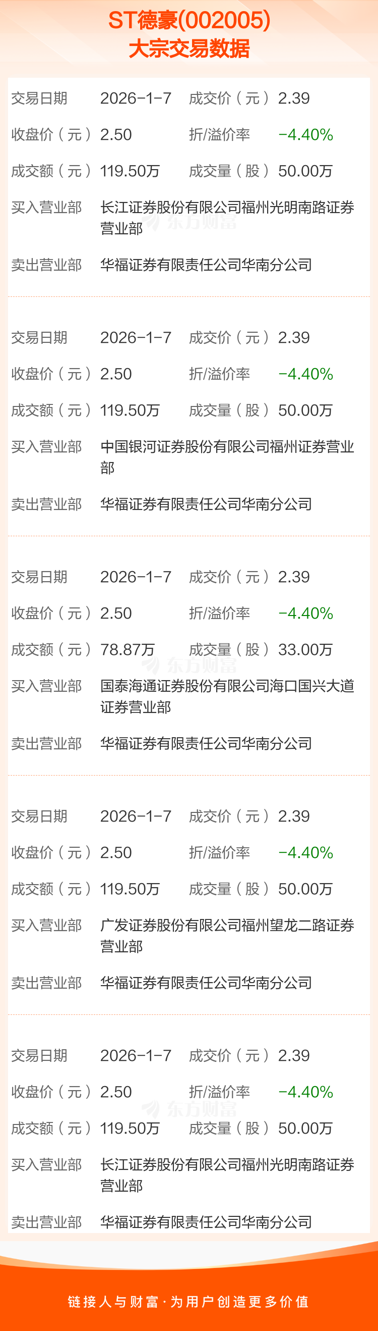 2026年1月7日,ST德豪发生5笔大宗交易,共成交233.00万股,成交金额556.87万元,占其流通市值比例为0.13%。