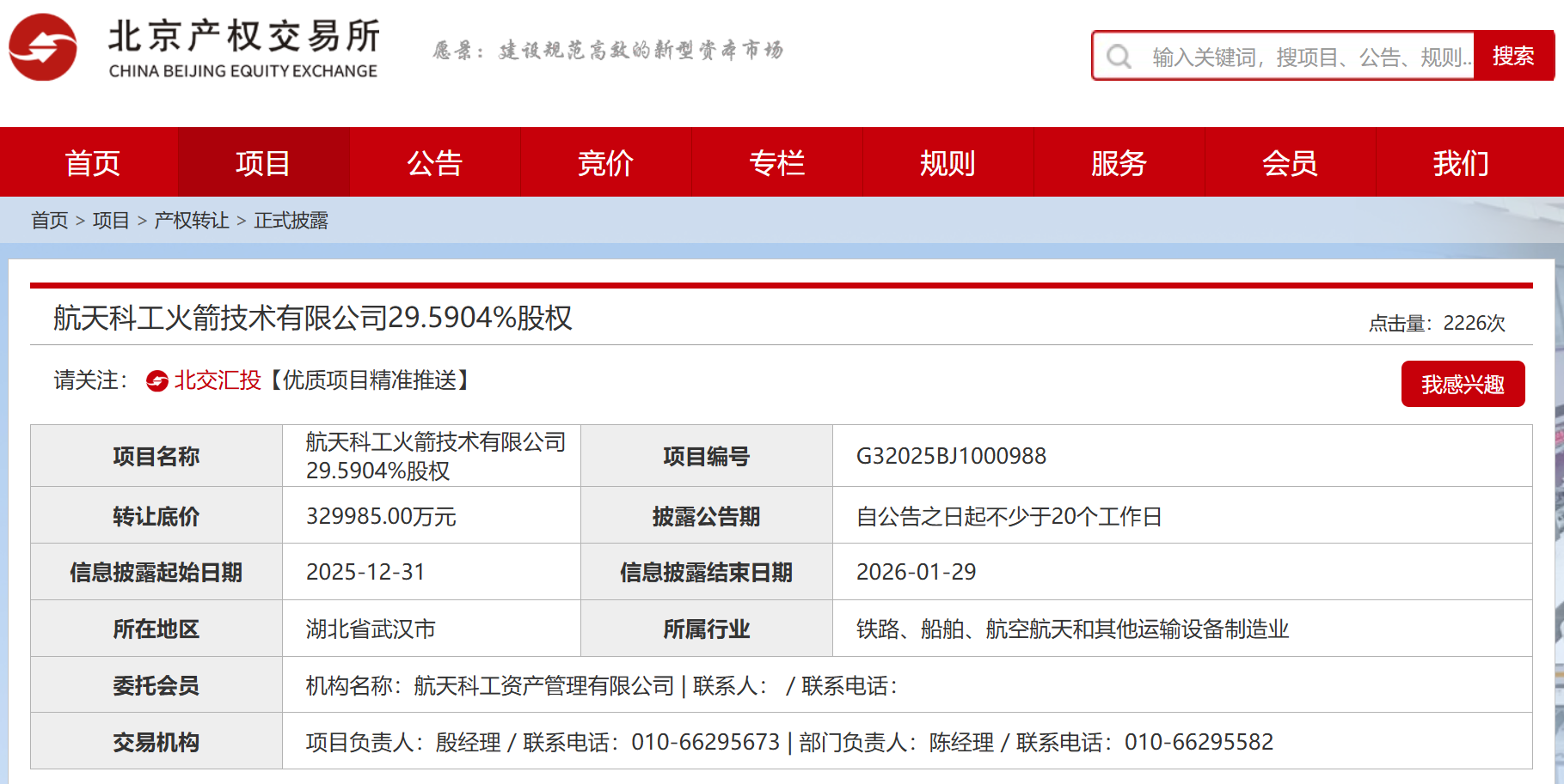 近日,北京产权交易所信息显示,航天科工火箭技术有限公司(简称“科工火箭”)29.5904%股权正在挂牌转让,转让底价约33亿元,转让方为中国航天三江集团有限公司(简称“航天三江”)。以此计算,科工火箭的整体估值约为112亿元。
