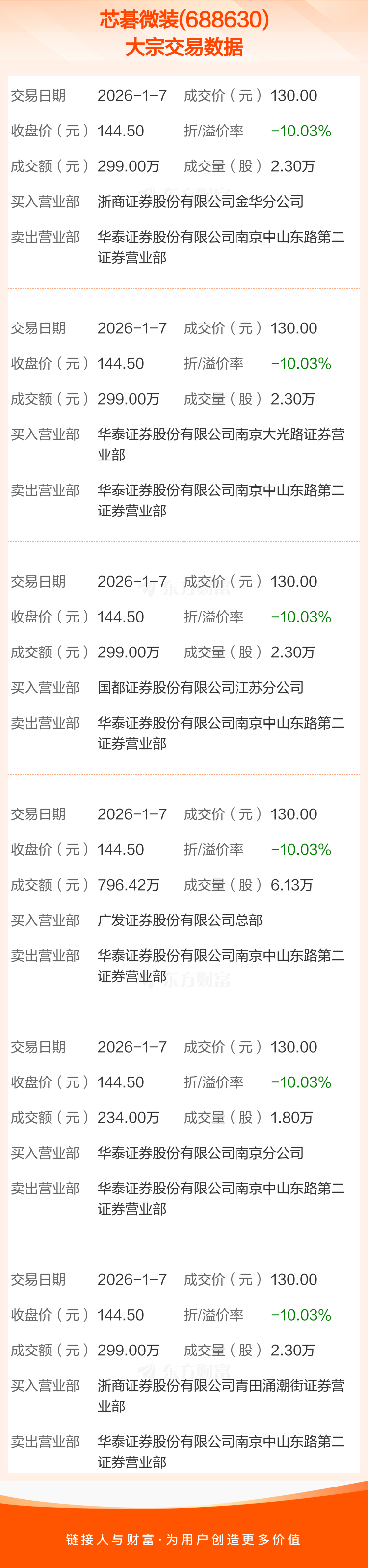6笔大宗交易成交均价129.97元,较该股当日收盘价144.50元折价10.05%。