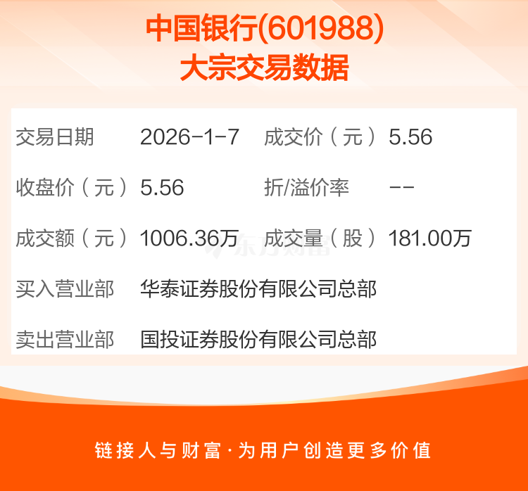 2026年1月7日,中国银行发生1笔大宗交易,共成交181.00万股,成交金额1006.36万元。