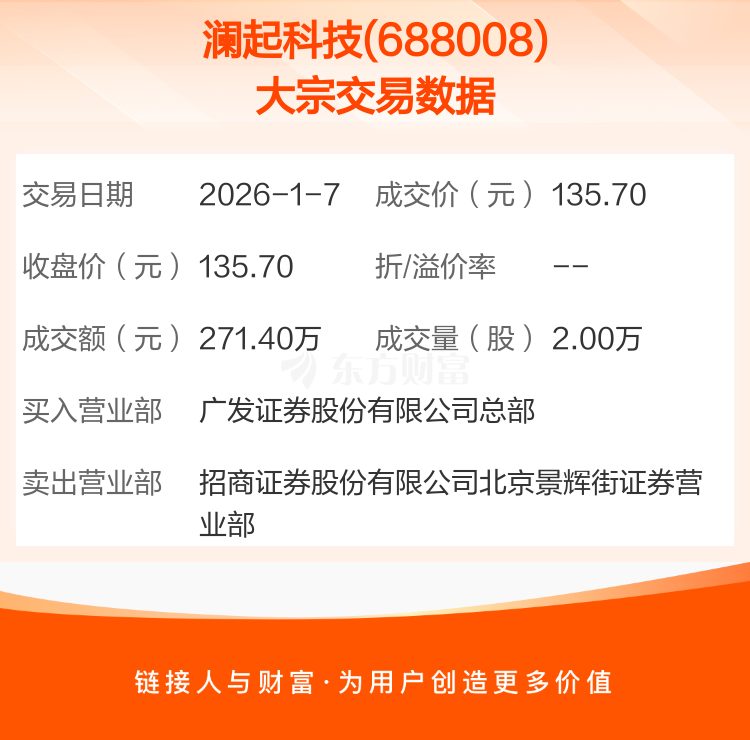 2026年1月7日,澜起科技发生1笔大宗交易,共成交2.00万股,成交金额271.40万元。