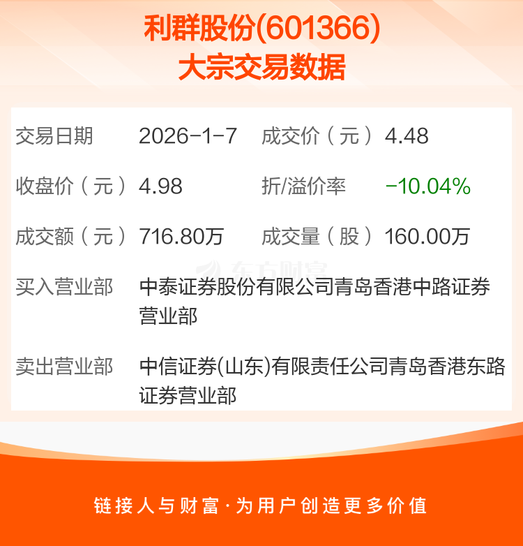 大宗交易:利群股份成交716.80万元,折价10.04%(1-7)