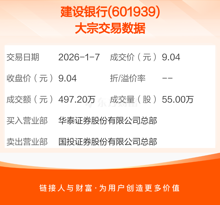 2026年1月7日,建设银行发生1笔大宗交易,共成交55.00万股,成交金额497.20万元。