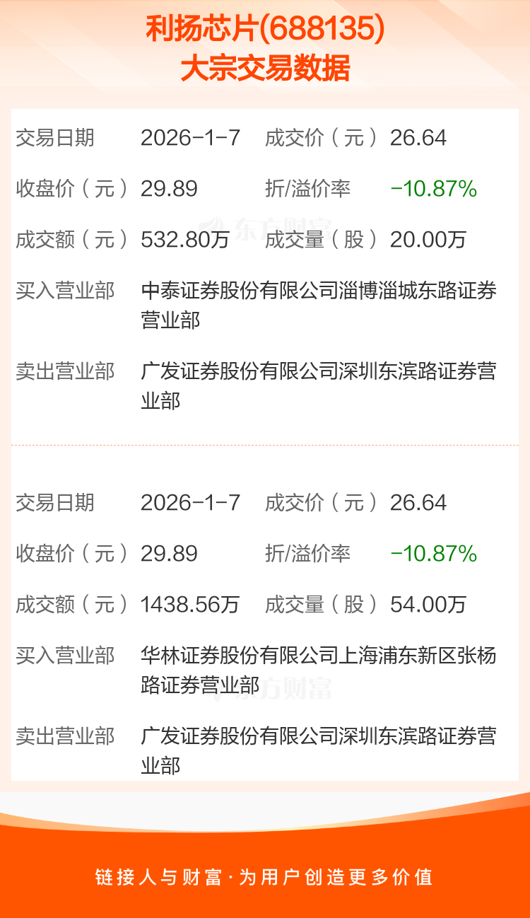 2026年1月7日,利扬芯片发生2笔大宗交易,共成交74.00万股,成交金额1971.36万元,占其流通市值比例为0.32%。