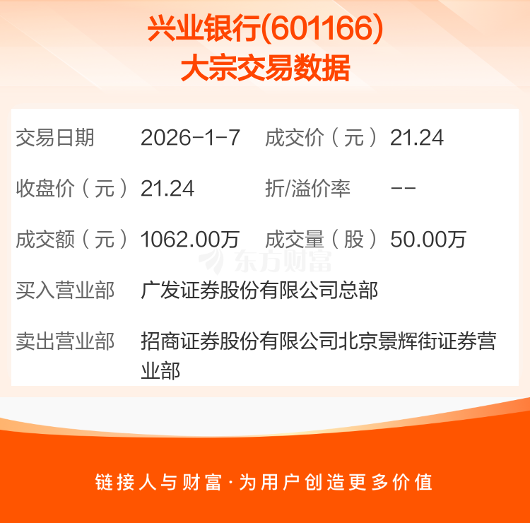 2026年1月7日,兴业银行发生1笔大宗交易,共成交50.00万股,成交金额1062.00万元。
