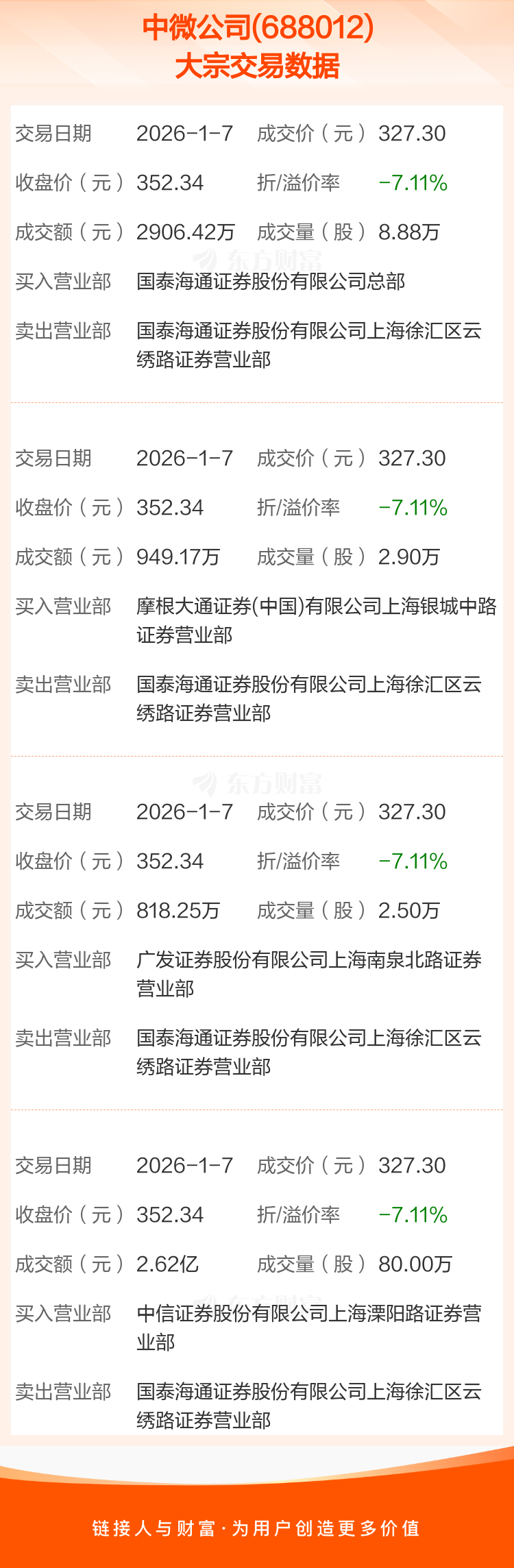 2026年1月7日,中微公司发生4笔大宗交易,共成交94.28万股,成交金额3.09亿元,占其流通市值比例为0.14%。