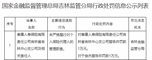泰康人寿吉林中支被罚1万,责任人被罚1万