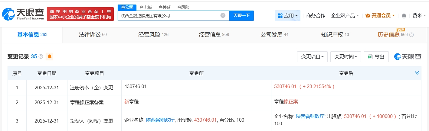 南方财经1月7日电,天眼查工商信息显示,近日,陕西金融控股集团有限公司发生工商变更,注册资本由约43.1亿人民币增至约53.1亿人民币,增幅约23%。陕西金融控股集团有限公司成立于2012年3月,法定代表人为王作全,经营范围包括资本运作及资产管理、股权投资及管理、受托管理专项资金、信用担保和再担保等。股东信息显示,该公司由陕西省财政厅全资持股。