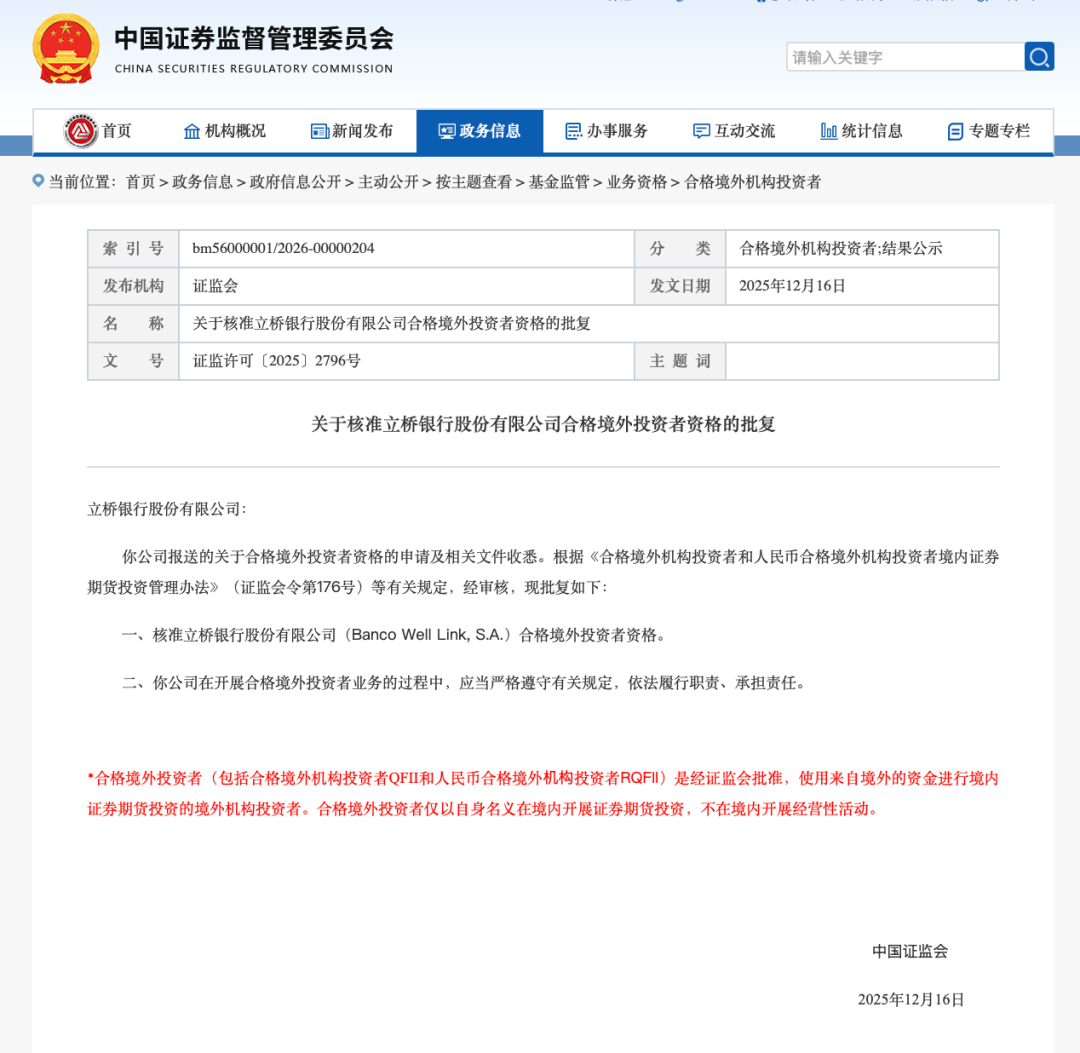 1月7日,中国证监会网站披露的批复文件显示,立桥银行股份有限公司(Banco Well Link,S.A.)、城堡顾问新加坡有限公司(Citadel Advisors Singapore Pte.Limited)已于2025年12月获批合格境外投资者资格。