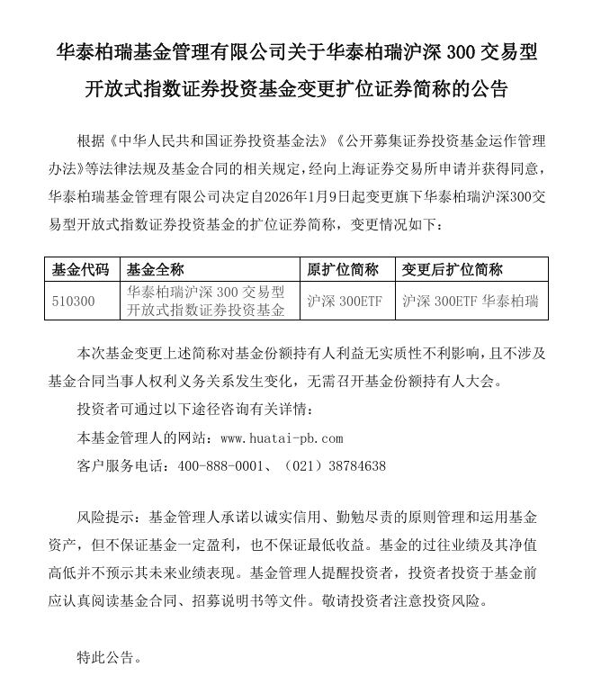 1月7日晚间,华泰柏瑞基金发布公告称,根据相关规定,经向上交所申请并获得同意,华泰柏瑞基金决定自1月9日起变更旗下华泰柏瑞沪深300ETF的扩位证券简称,由“沪深300ETF”变更为“沪深300ETF华泰柏瑞”。