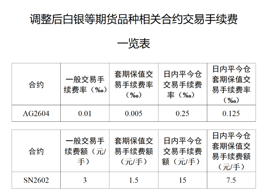 自2026年1月9日交易(即1月8日晚夜盘)起:白银期货AG2604合约日内平今仓交易手续费调整为成交金额的万分之二点五。锡期货SN2602合约日内平今仓交易手续费调整为15元/手。