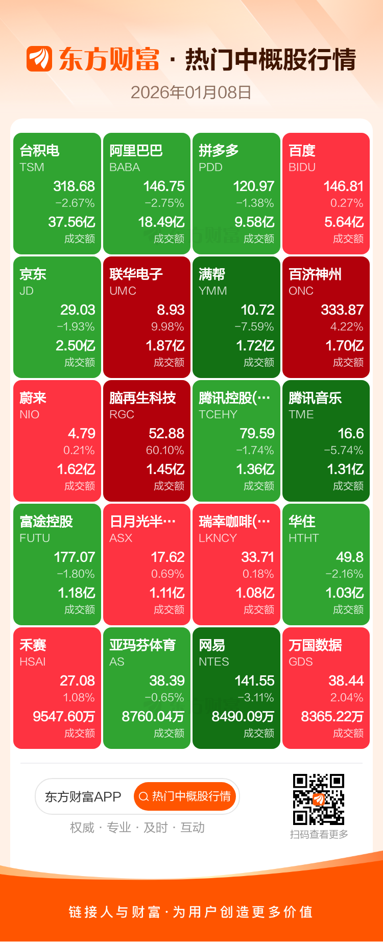 台积电跌2.67%,阿里巴巴跌2.75%,拼多多跌1.38%,百度涨0.27%,京东跌1.93%,联华电子涨9.98%,满帮跌7.59%,百济神州涨4.22%,蔚来涨0.21%,脑再生科技涨60.10%。