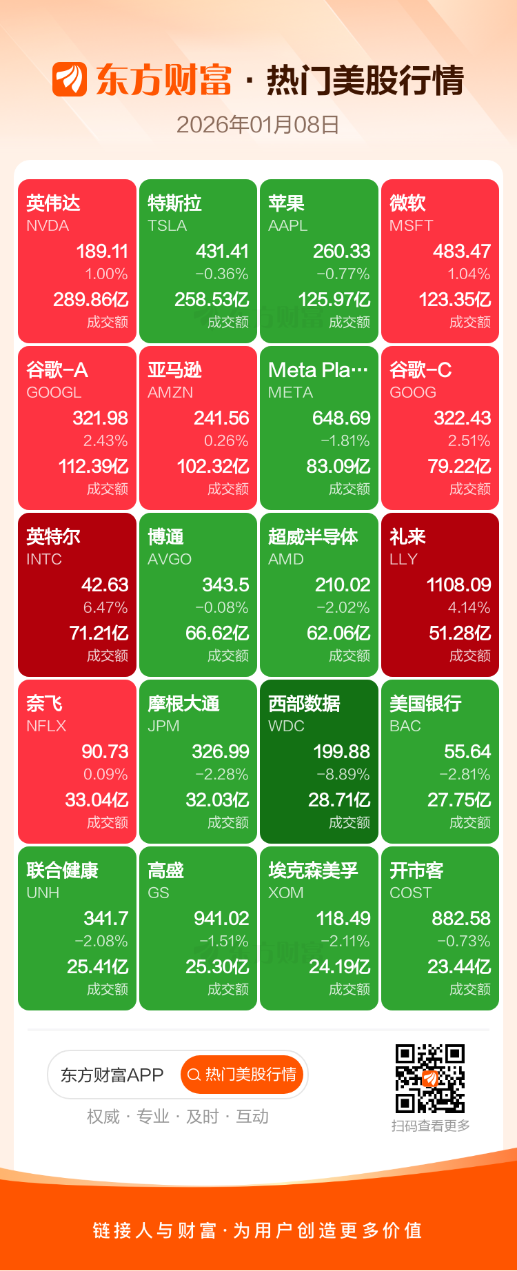 英伟达涨1.00%,特斯拉跌0.36%,苹果跌0.77%,微软涨1.04%,谷歌-A涨2.43%,亚马逊涨0.26%,Meta Platforms Inc-A跌1.81%,谷歌-C涨2.51%,英特尔涨6.47%,博通跌0.08%。