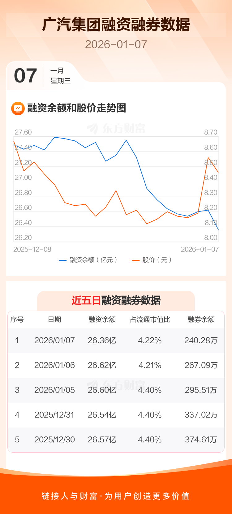 交易所最新数据显示,广汽集团于2026年1月7日获融资买入5829.39万元,融资偿还8370.96万元,当日融资净偿还2541.57万元。目前,该股融资余额26.36亿,占流通市值比例为4.22%。