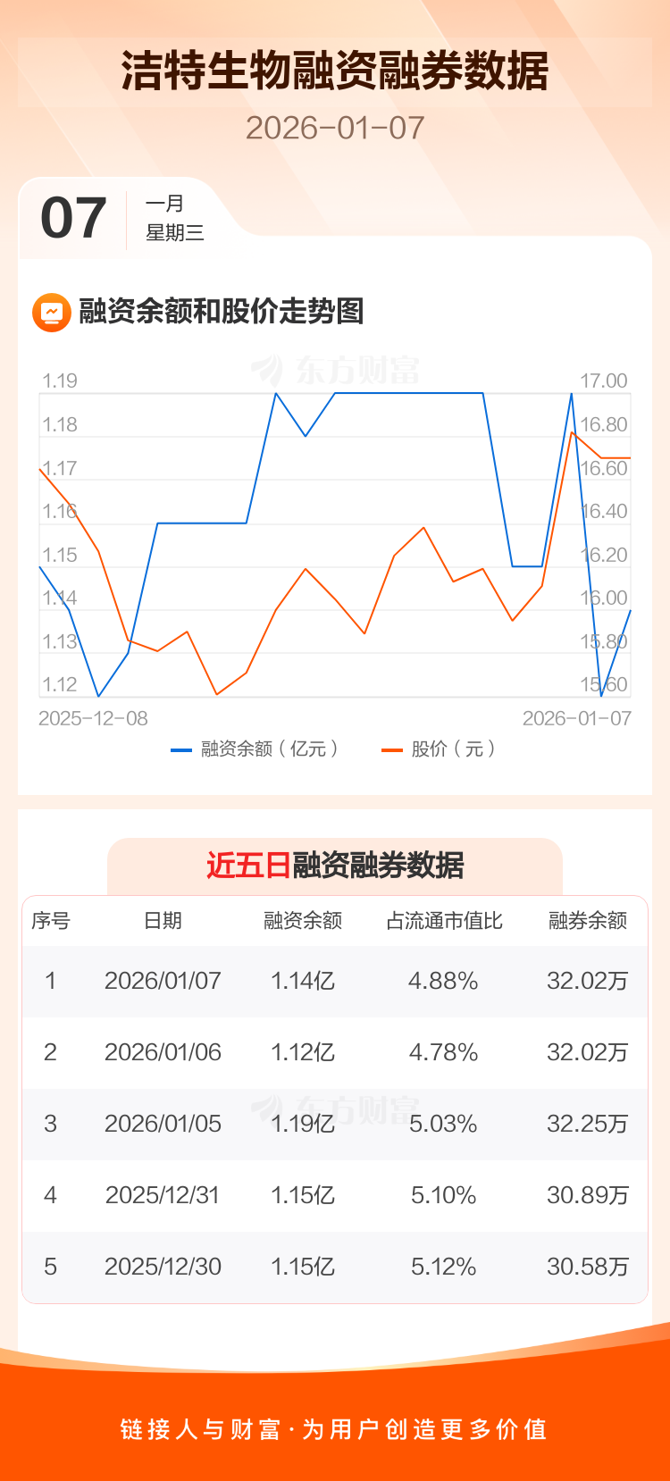 交易所最新数据显示,洁特生物于2026年1月7日获融资买入722.30万元,融资偿还498.80万元,当日融资净买入223.5万元。目前,该股融资余额1.14亿,占流通市值比例为4.88%。