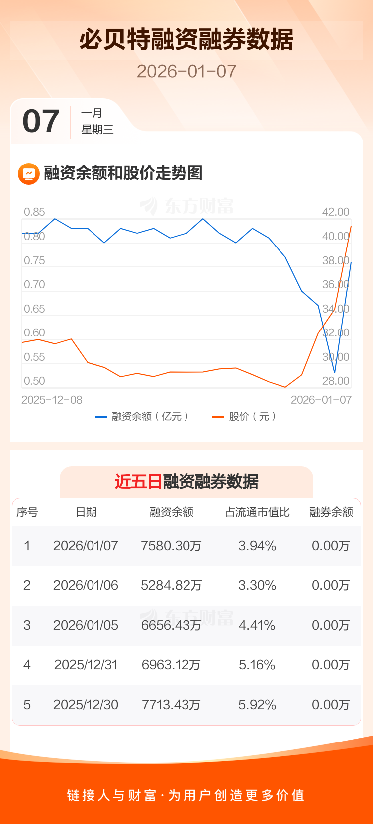 交易所最新数据显示,必贝特于2026年1月7日获融资买入4685.10万元,融资偿还2389.62万元,当日融资净买入2295.48万元。目前,该股融资余额7580.30万,占流通市值比例为3.94%。