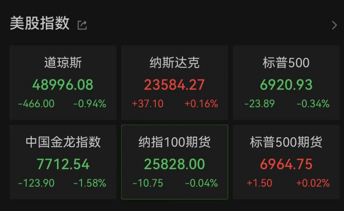 当地时间1月7日,美三大股指收盘涨跌不一。截至收盘,道指跌0.94%报48996.08点,标普500指数跌0.34%报6920.93点,纳指涨0.16%报23584.27点。