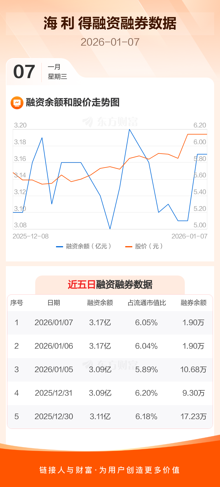 交易所最新数据显示,海 利 得于2026年1月7日获融资买入935.42万元,融资偿还896.88万元,当日融资净买入38.55万元。目前,该股融资余额3.17亿,占流通市值比例为6.05%。