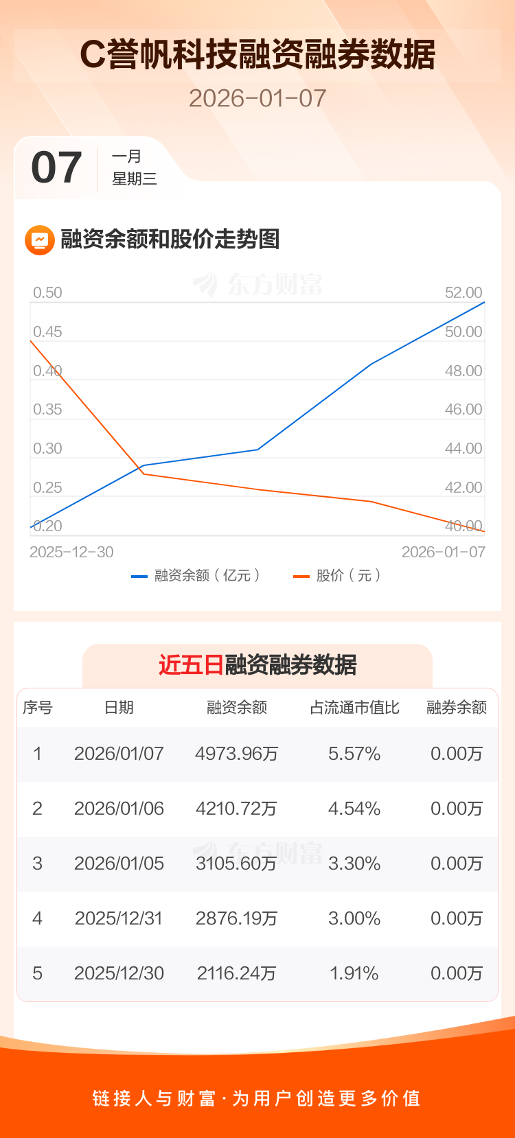 交易所最新数据显示,C誉帆科技于2026年1月7日获融资买入2565.09万元,融资偿还1801.85万元,当日融资净买入763.24万元。目前,该股融资余额4973.96万,占流通市值比例为5.57%。