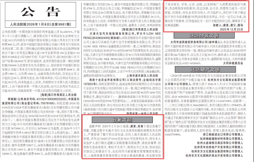 【大河财立方消息】1月8日,《人民法院报》刊登了海底捞小便当事人唐某及其父母的道歉声明。