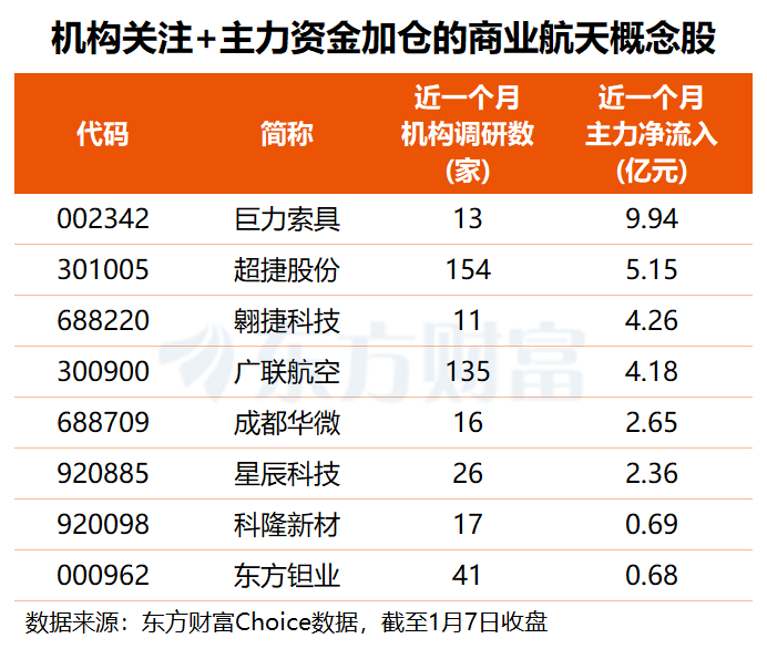 东方财富Choice数据显示,近一个月以来,主力资金净流入超5000万元、机构调研数超10家的商业航天概念股共8只。其中,巨力索具获近10亿元主力资金净流入;超捷股份、广联航空分别获主力资金加仓5.15亿、4.18亿元,两家公司近期均获超百家机构扎堆调研。