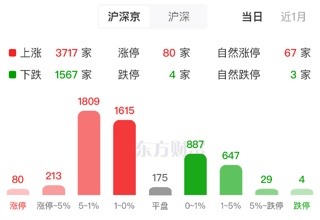 量能方面,两市半天成交1.77万亿元,较昨日同期缩量约701亿元;超3700股早盘飘红,80股涨停,封板率约75%。