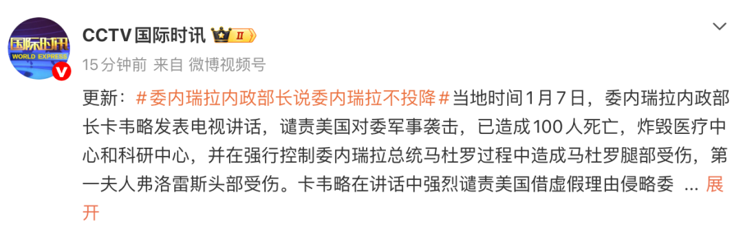 当地时间1月7日,委内瑞拉内政部长迪奥斯达多·卡韦略表示,美国1月3日对委的袭击已造成100人死亡,其中包括平民。袭击还炸毁了委内瑞拉的医疗中心和科研中心。此外,第一夫人西利娅·弗洛雷斯在突袭行动中头部受伤,总统马杜罗腿部受伤。