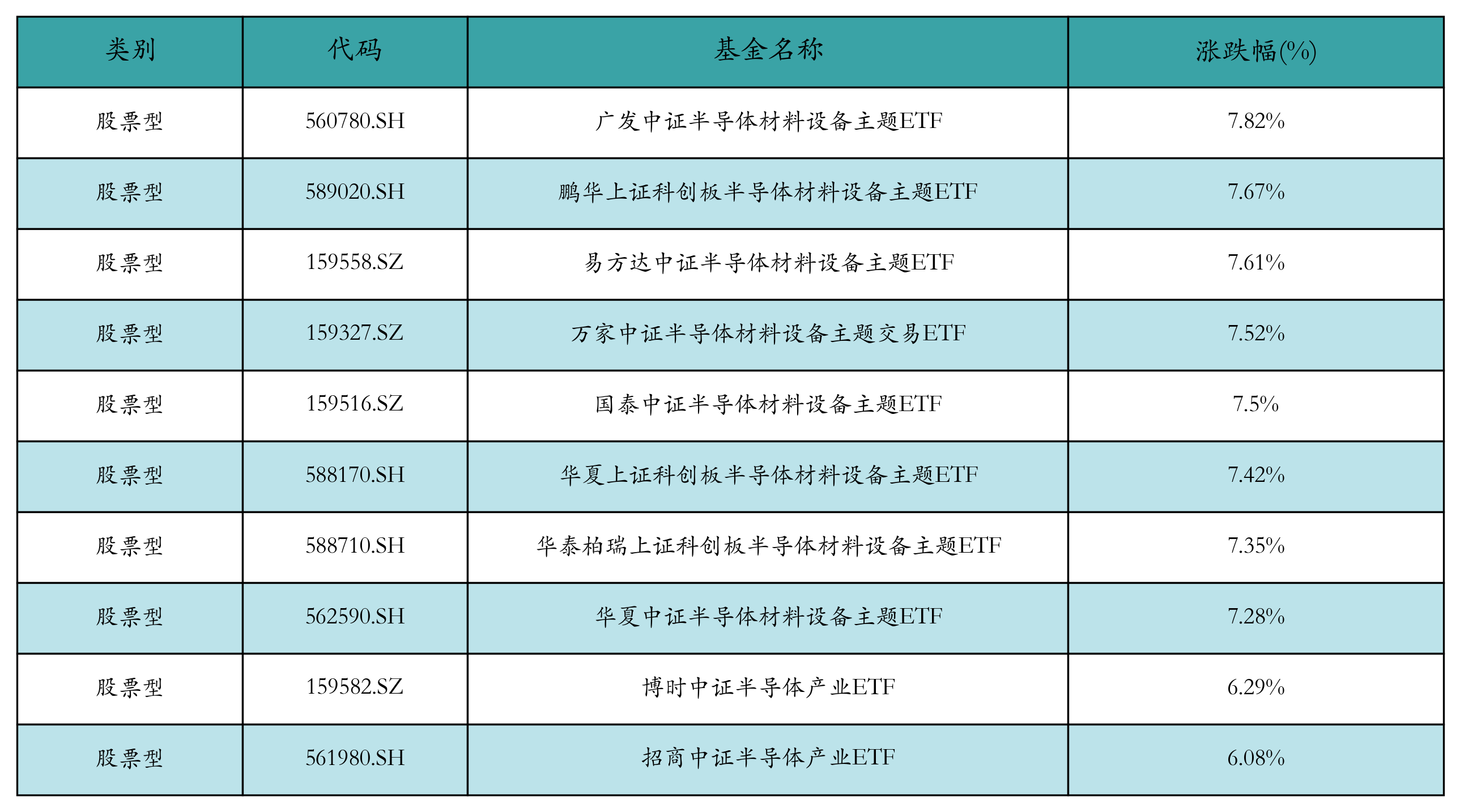 昨日股票型ETF涨幅最高的3只ETF及其收益率分别为:广发中证半导体材料设备主题ETF(7.82%)、鹏华上证科创板半导体材料设备主题ETF(7.67%)、易方达中证半导体材料设备主题ETF(7.61%)。涨幅前10详情见下表: