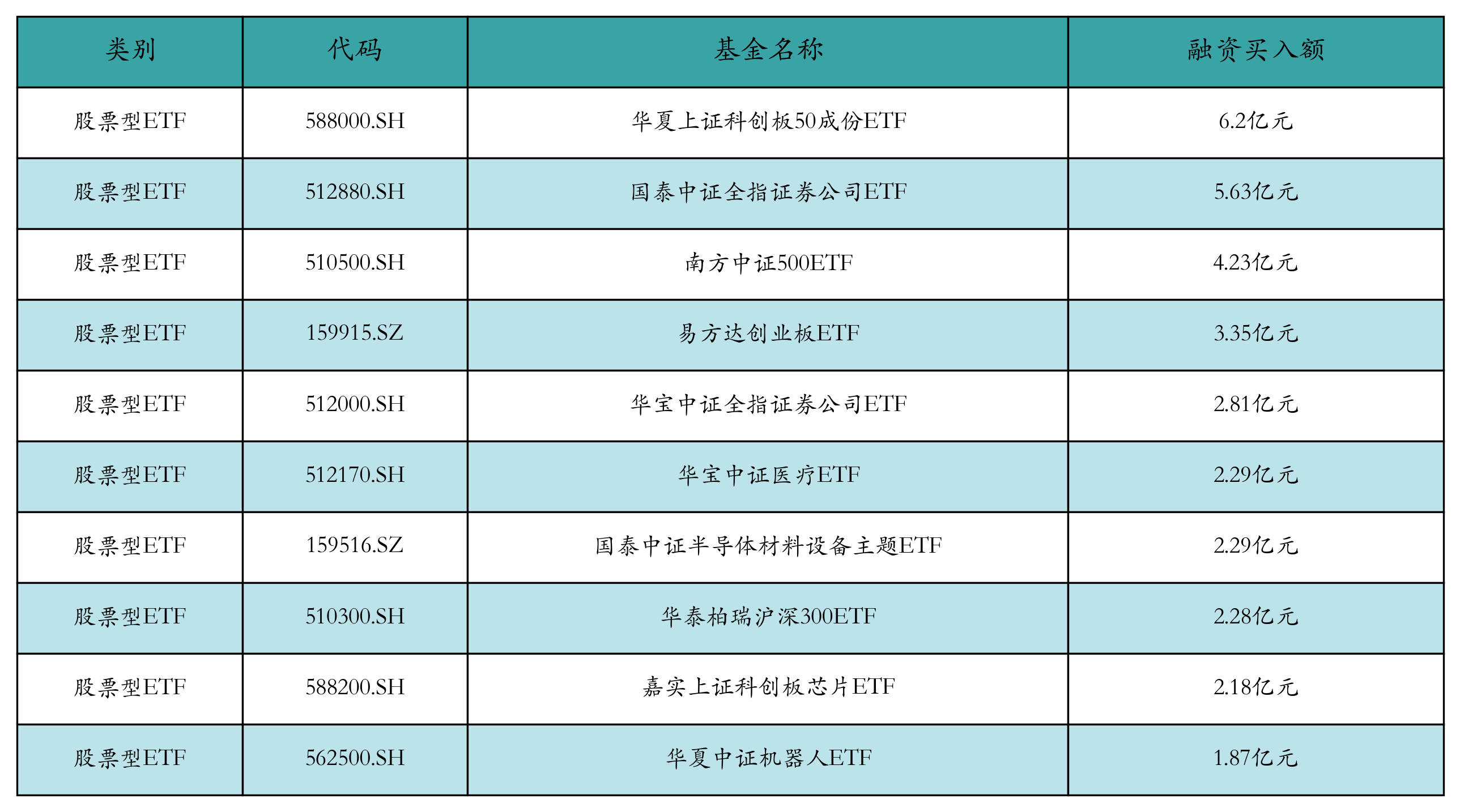 昨日股票型ETF融资买入额最高的3只ETF及其买入金额分别为:华夏上证科创板50成份ETF(6.2亿元)、国泰中证全指证券公司ETF(5.63亿元)、南方中证500ETF(4.23亿元)。融资买入额前10详情见下表: