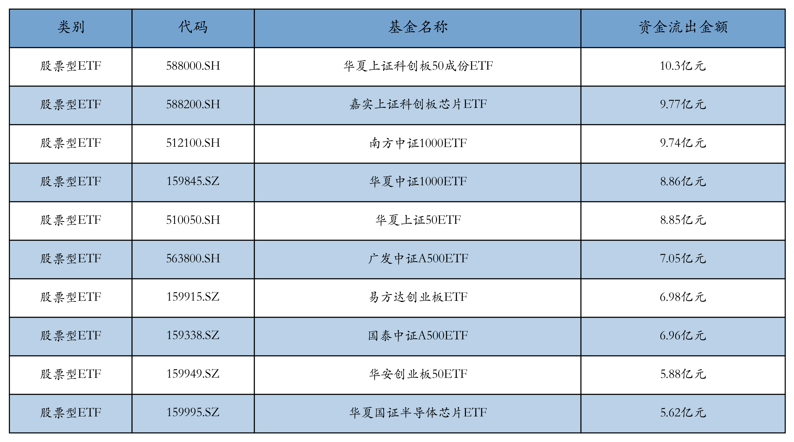 昨日股票型ETF资金流出最多的3只ETF及其流出金额分别为:华夏上证科创板50成份ETF(流出10.3亿元)、嘉实上证科创板芯片ETF(流出9.77亿元)、南方中证1000ETF(流出9.74亿元)。资金流出前10详情见下表: