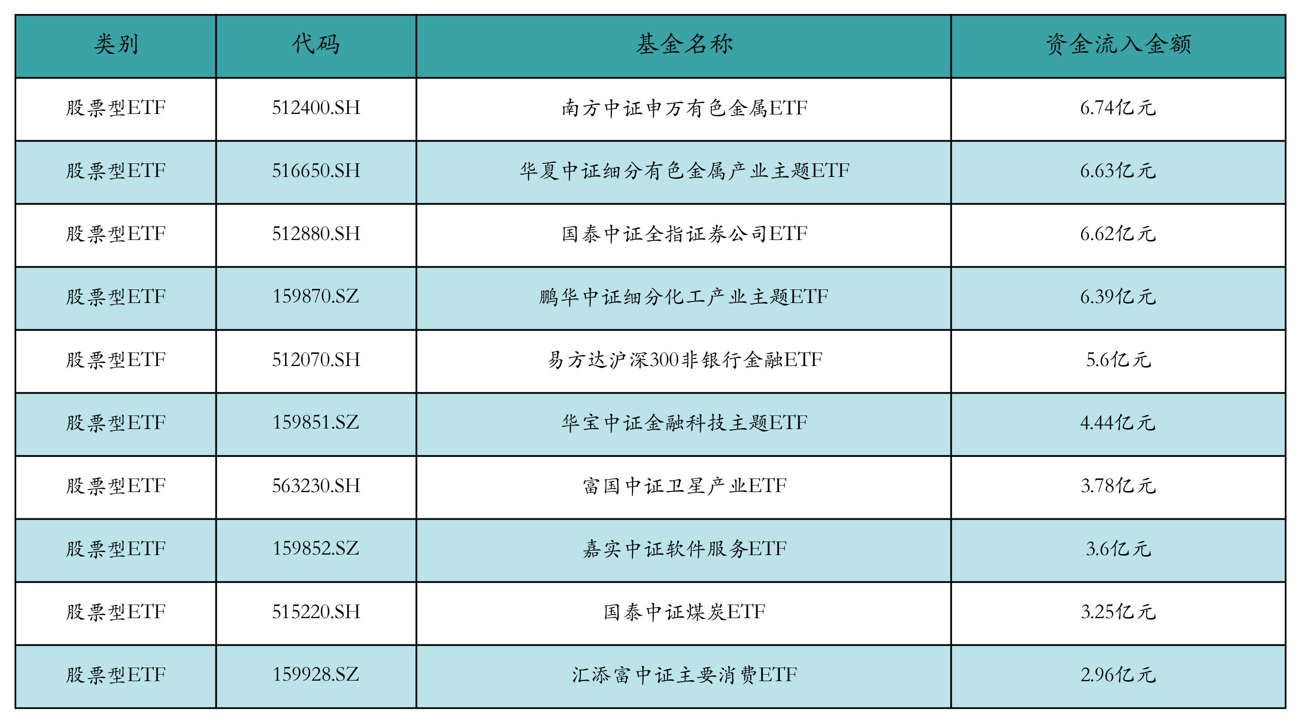 昨日股票型ETF资金流入最多的3只ETF及其流入金额分别为:南方中证申万有色金属ETF(流入6.74亿元)、华夏中证细分有色金属产业主题ETF(流入6.63亿元)、国泰中证全指证券公司ETF(流入6.62亿元)。资金流入前10详情见下表: