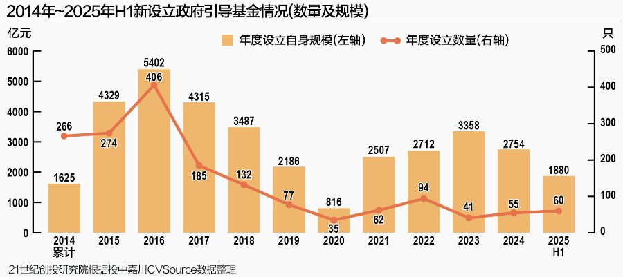投中嘉川CVSource数据显示,2025年1-6月,新设政府投资基金共计60只,超过2024年全年的55只。从规模上来看,2025年上半年新设政府投资基金规模1880亿元,2024年全年新设政府投资基金规模为2754亿元。