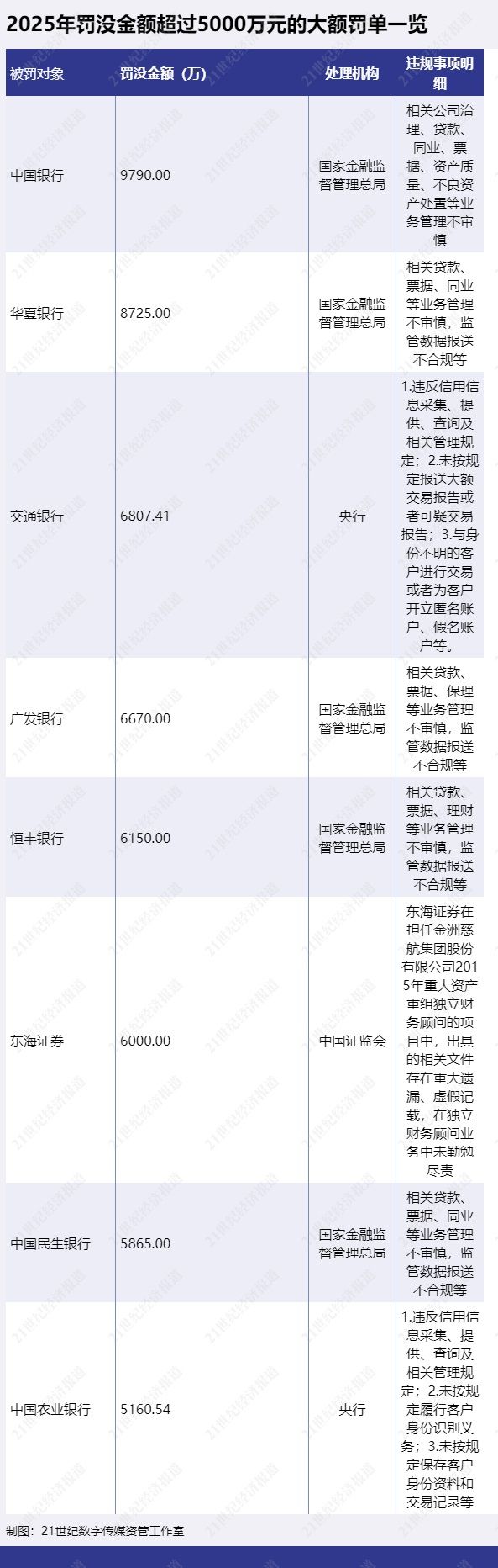 2025年金融机构共有8张罚单罚没金额超过5000万元,其中最大罚单,因“相关公司治理、贷款、同业、票据、资产质量、不良资产处置等业务管理不审慎”被国家金融监督管理总局罚没9790万元。