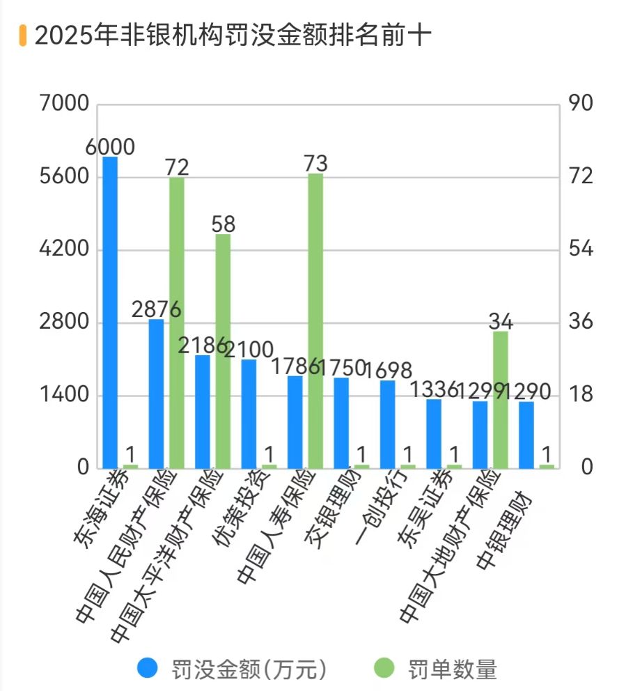 2025年罚没金额排第一的非银机构为东海证券,合计被罚没6000万元,主要由于有一笔大额罚单。中国人民财产保险合计罚没金额2875.68万元排第二,中国太平洋财产保险以2186.3万元的罚没金额排第三。