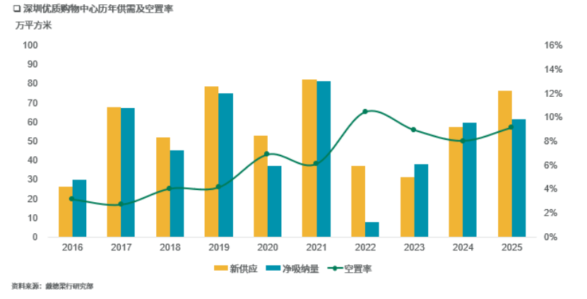 根据报告,2025年深圳优质购物中心新增供应量76.3 万平方米,总存量达到 793.7 万平方米;截至2025年末,深圳全市甲级写字楼存量规模达到908.2万平方米,未来四年有望投入使用的甲级写字楼计划供应量或将超过 500 万平方米。
