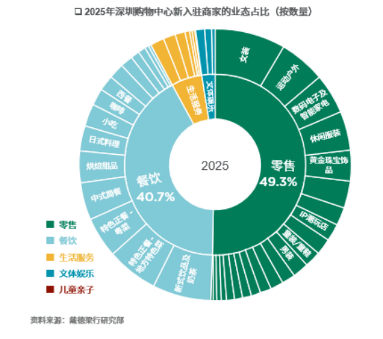 业态创新成为零售市场的核心抓手。从新入驻商家结构来看,2025年零售业态以49.3%的占比保持主导地位,餐饮业态占比提升0.8个百分点至40.7%,生活服务类占比微升至5.4%。