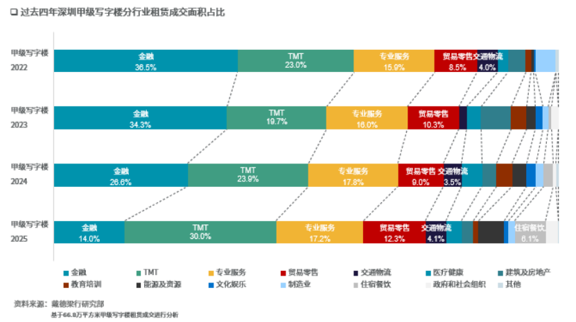 张晓端认为,尽管写字楼市场整体需求增长动能偏弱,但也涌现出一些结构性机会 。TMT行业贡献了全年最多的甲级写字楼租赁需求,占比约达总需求的三分之一。其中,AI产业的快速发展带动相关企业租赁活跃度提升;新兴消费电子类企业因业务扩张产生职场升级需求,正逐步成为租赁需求增长的主力来源。